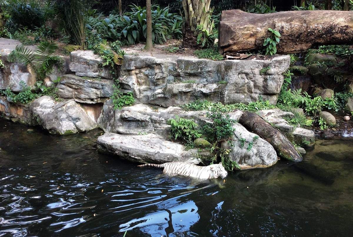 Le lendemain nous filons dans le nord de la ville pour découvrir l'immense zoo. Celui-ci à la particularité de laisser de nombreux animaux en liberté dans de grandes serres dans lesquelles on peut entrer. On est donc en contact très proche avec de nombreuses espèces. Et bien sûr celles-ci sont très bien représentées pour les animaux asiatiques en général et d'Asie du sud est en particulier. Le zoo compte par exemple deux tigres blancs, d'innombrables singes, des écureuils volants, etc. Après 3h de balade le zoo ferme, on s'alimente rapidement pour... remettre ça ! Le deuxième zoo va ouvrir pour le « Night Safari ». Ce qui sous-tend cette activité est le fait que 80% des animaux présentés s'éveillent en fait la nuit. Si on veut avoir la chance de les voir en activité de manière naturelle, c'est donc à partir de la tombée du jour qu'il faut se mettre à les chercher. C'est aussi pour cette raison que de nombreuses randonnées nocturnes sont organisées à Bornéo. L'ambiance est vraiment différente : on ne voit plus les barrières et l'éclairage est équivalent à celui de la lune. On se concentre alors plus sur les bruits qui prennent une toute autre ampleur, la plupart des gens adaptent d'ailleurs leurs conversations en les réduisant au silence.