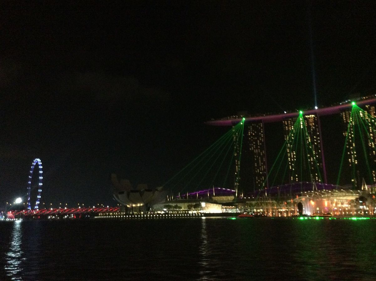 Laissant Marc à sa prochaine réunion nous traversons le centre commercial adossé au Marina Bay en suivant des yeux les barques qui circulent au milieu pour arriver juste à temps au spectacle de son et lumière sur jets d'eau qui est organisé pendant un mois le long de la rivière. On se décide ensuite pour un tour en navette bateau by night pour rejoindre Clark Quay... les quais aménagés et très animés en soirée qui donnent le spectacle de petits restaurants dans des maisons anciennes avec terrasses sur la rivière sur fond de gratte-ciels rivalisant d'excentricité.